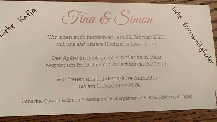 Das Brautpaar dankt den anwesenden Mitgliedern herzlich für die gelungene Überraschung und das grosszügige Geschenk!